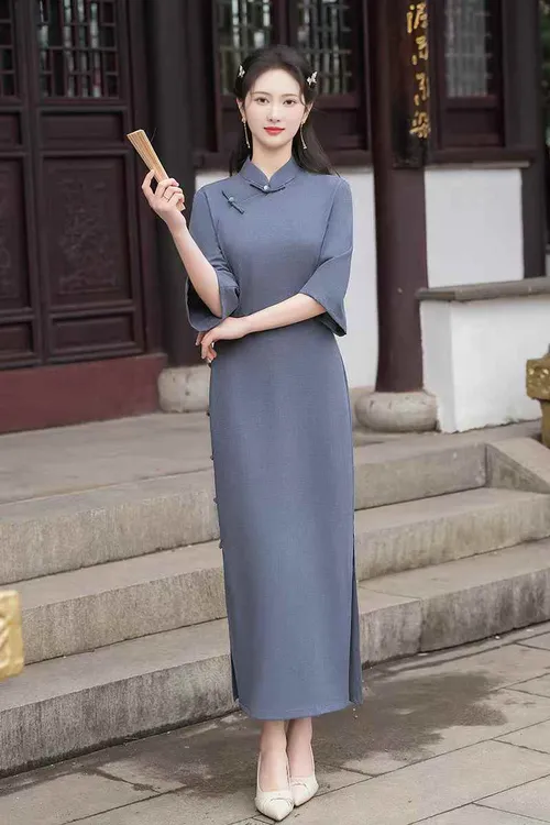 【25秋款】雾蓝 古法全开襟旗袍新中式网红中袖